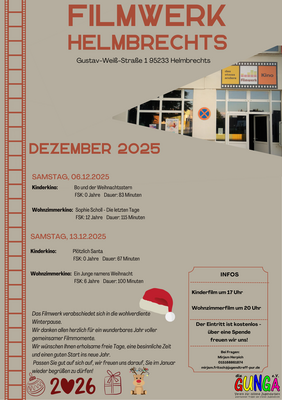 Als gemeinnützig anerkannter Verein zeigen wir Filme nicht, um damit Gewinne zu erzielen. Stattdessen liegt es uns am Herzen, den Bürger*innen aus allen Altersstufen ein Programm anzubieten, das nicht nur die verschiedensten Geschmäcker trifft, sondern auch pädagogisch wertvoll ist. Unser Kino wird durch die ehrenamtliche Mitarbeiter*innen (Kinder und Erwachsene) betrieben. Koordiniert wird diese Arbeit durch den Verein Die Gunga e.V. und den Helmbrechtser Jugendtreff. Die Kinovorstellungen basieren auf Spendenbasis, jeder gibt, was er kann und möchte.